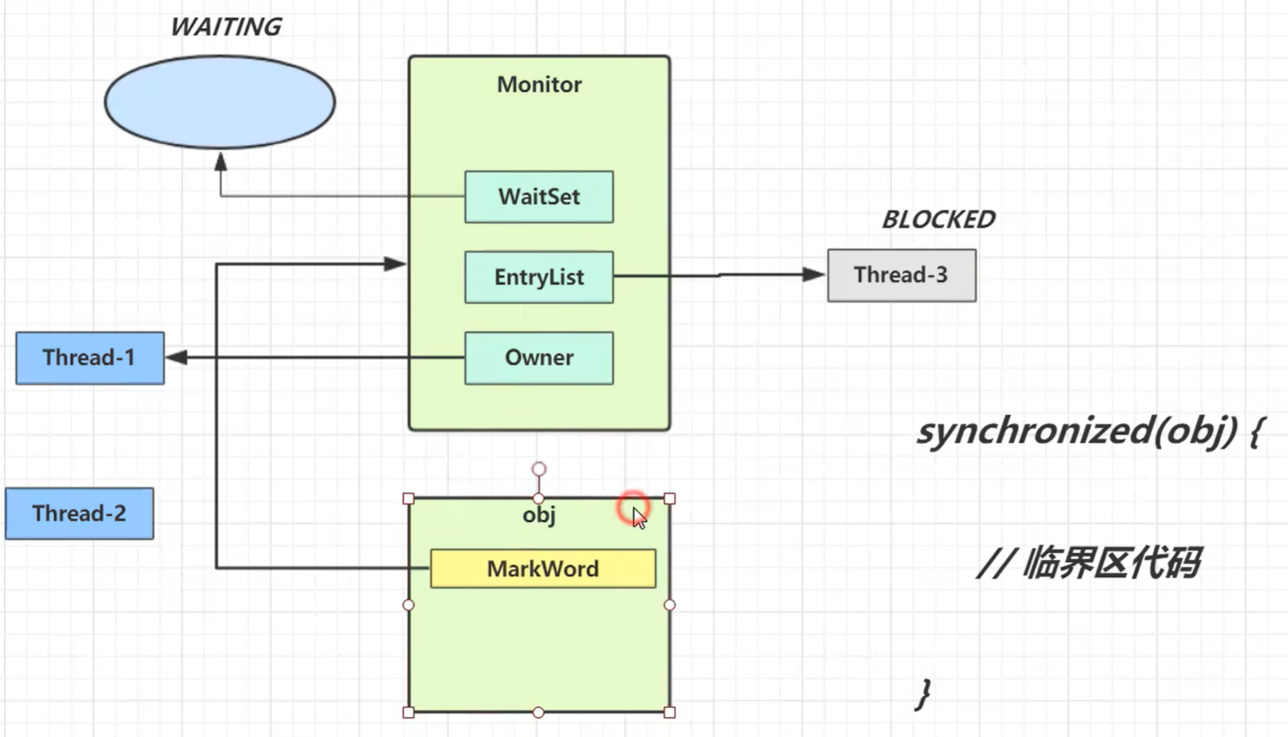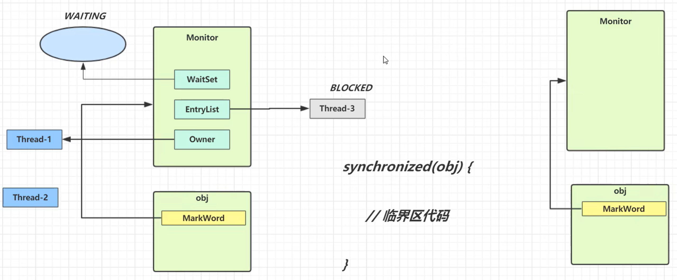 会去检查obj对象的MarkWord是否关联monitor对象(操作系统提供),